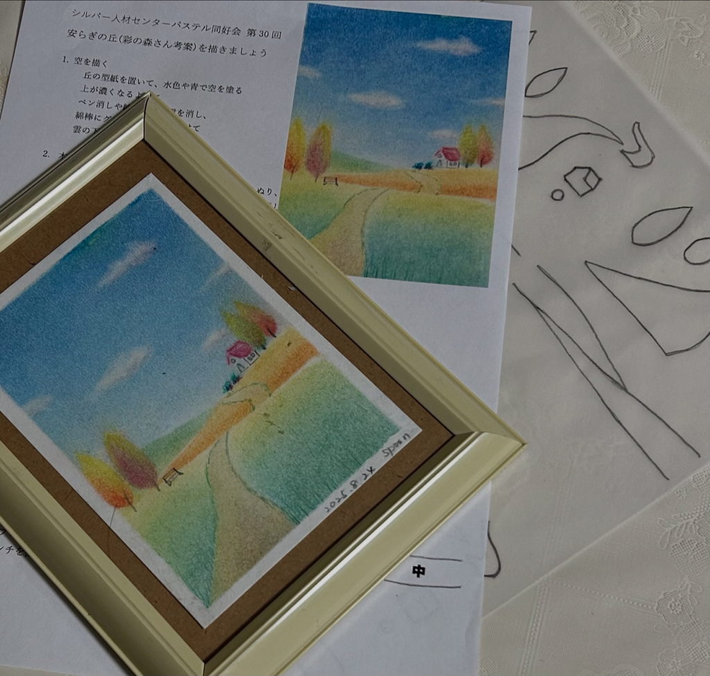 彩の森さん考案安らぎの丘、ハガキサイズアレンジダイソーパステルで。これはみんなで9月に描く予定です。手順書も作成して準備万端?!
