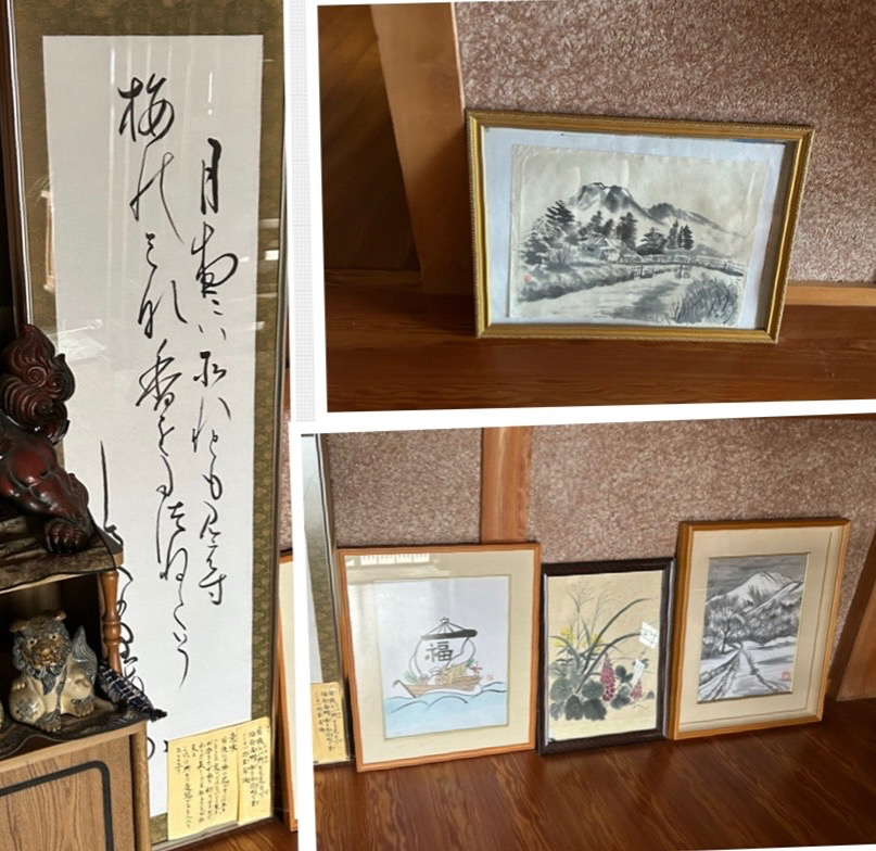 火曜日は畑、買い物の後帰省。冷蔵庫に残っていた小豆で赤飯炊いて持参。煮魚やサラダ、味噌汁など、母、兄、妹と私たち夫婦の5人で食卓を囲みました。水曜日は朝からあちこちお掃除。玄関に母が以前に描いた作品を飾っていました。