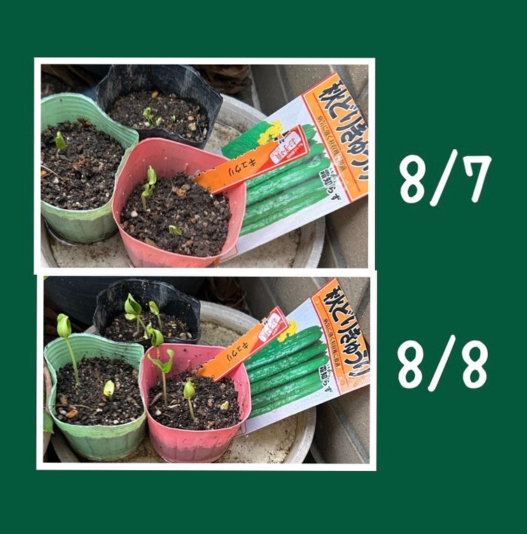 3週間ぶりでまとまった雨が降りました。モヤっとしていた空気が一掃されて気持ちいいです。で、気が付けばベランダのポリポットに蒔いた秋きゅうりが発芽していました。昼間はいいお天気でしたが、夜に又ザーッと降って、8日の朝にはさらに伸びていました。このまま順調に育ってくれますように。