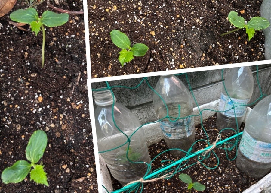 先日種まきした秋きゅうり。前線の雨があるうちにプランターに植え替えました。まだまだひ弱なので、ペットボトルのカバーをして過保護に育てています。ようやく本葉がでてきて、なんとか育ってくれてるようです。