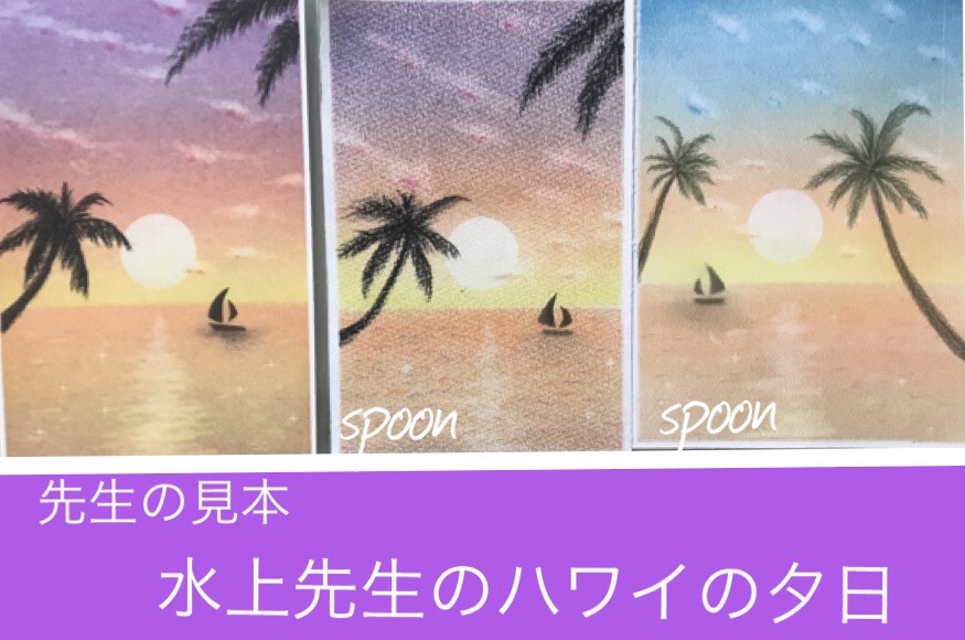 水上先生がハワイの夕日の見本を送ってくださったので、早速復習。左が見本、真ん中が紙を変えての復習。右は以前に先生が描かれていた青空も見える夕日。
